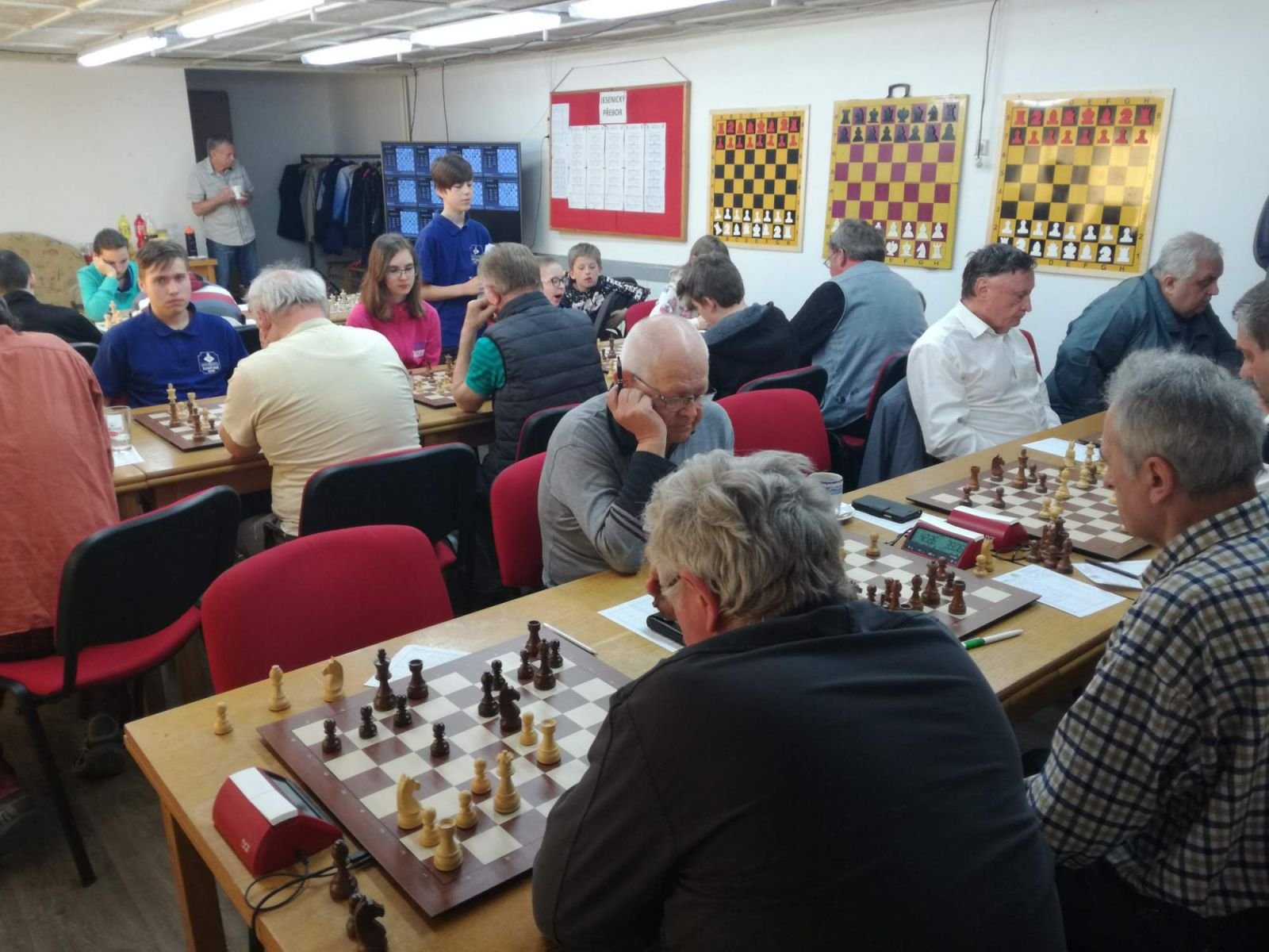 Jesenický přebor družstev byl završen 13. a 14. kolemV sobotu 20.4.2019 byl 13. a 14. kolem završen Jesenický přebor družstev ročníku 2018/2019. Čtyři ze šesti zápasů se opět hrály na elektronických šachovnicích a můžete si je přehrát v odkazech níže. V tomto závěrečném dvojkole se rozhodovalo o vítězi přeboru. Opět nebyla nouze o kvalitní a dramatické partie. Celkem 32 hráčů si ve 30 partiích nic nedarovalo. Největším překvapením 13. kola byla remíza dosud posledního jesenického Géčka s dosavadním lídrem soutěže, družstvem SK Řetězárna C. V závěrečném 14. kole pak proběhlo nejsledovanější utkání, ve kterém se o celkové vítězství v přeboru utkala ve vzájemném zápasu družstva SK Řetězárna C a ŠK Skorošice. Borcům z českoveského Céčka stačila k titulu přeborníka remíza, a tak skorošickým šachistům nezbývalo nic jiného než hrát na vítězství. Vývoj utkání tomu také odpovídal, hrálo se „zostra“ a bez taktizování. Nejprve to vypadalo lépe pro ŠK Skorošice, které vedly 2:1 a ve zbývajících dvou partiích sahaly minimálně v jednom případě po jasném vítězství. Jenže vyhranou partii nakonec zremizovali a poslední partii dokonce prohráli což znamenalo, že zápas skončil remízou 2,5 ku 2,5. Celkovým vítězem soutěže se tak nakonec po boji, ale zcela zaslouženě stalo družstvo SK Řetězárna C, které vedlo tabulku přeboru od prvního kola a zvítězilo způsobem start-cíl. Druhé skončilo družstvo ŠK SKorošice a třetí ŠK Jeseník C. Vítězem v kategorii žen bylo vyhlášeno družstvo ŠK Jeseník F. Jesenického přeboru se zúčastnilo rekordních 7 družstev a ve 14. kolech bylo odehráno celkem 42 zápasů. Do bojů zasáhlo celkem 50 šachistů všech věkových kategorií od nejmladšího 8-letého Vojtěcha Vaníčka až po nejstaršího 79-letého Emila Turoně. Všem hráčům patří velký dík za předvedené výkony a fair play chování během celé soutěže. Velké poděkování patří také Šachovému klubu Jeseník, který kompletně celý Jesenický přebor družstev zorganizoval a ze všech kol také pořídil online přenosy, které naleznete v odkaze zde. • 13. a 14. kolo - 20.04.2019 - výsledky a konečné pořadí - - fotogalerie - • online přenos 13. kola (ŠK Skorošice - ŠK Jeseník C 3½ : 1½ a SK Řetězárna C - ŠK Jeseník G 2½ : 2½) naleznete v odkaze zde nebo se zapnutým motorem (engine) v odkaze zde • online přenos 14. kola (ŠK Skorošice - SK Řetězárna C 2½ : 2½ a ŠK Jeseník F - ŠK Jeseník G 2 : 3) naleznete v odkaze zde nebo se zapnutým motorem (engine) v odkaze zde • vše o přeboru nalezne zde | |
