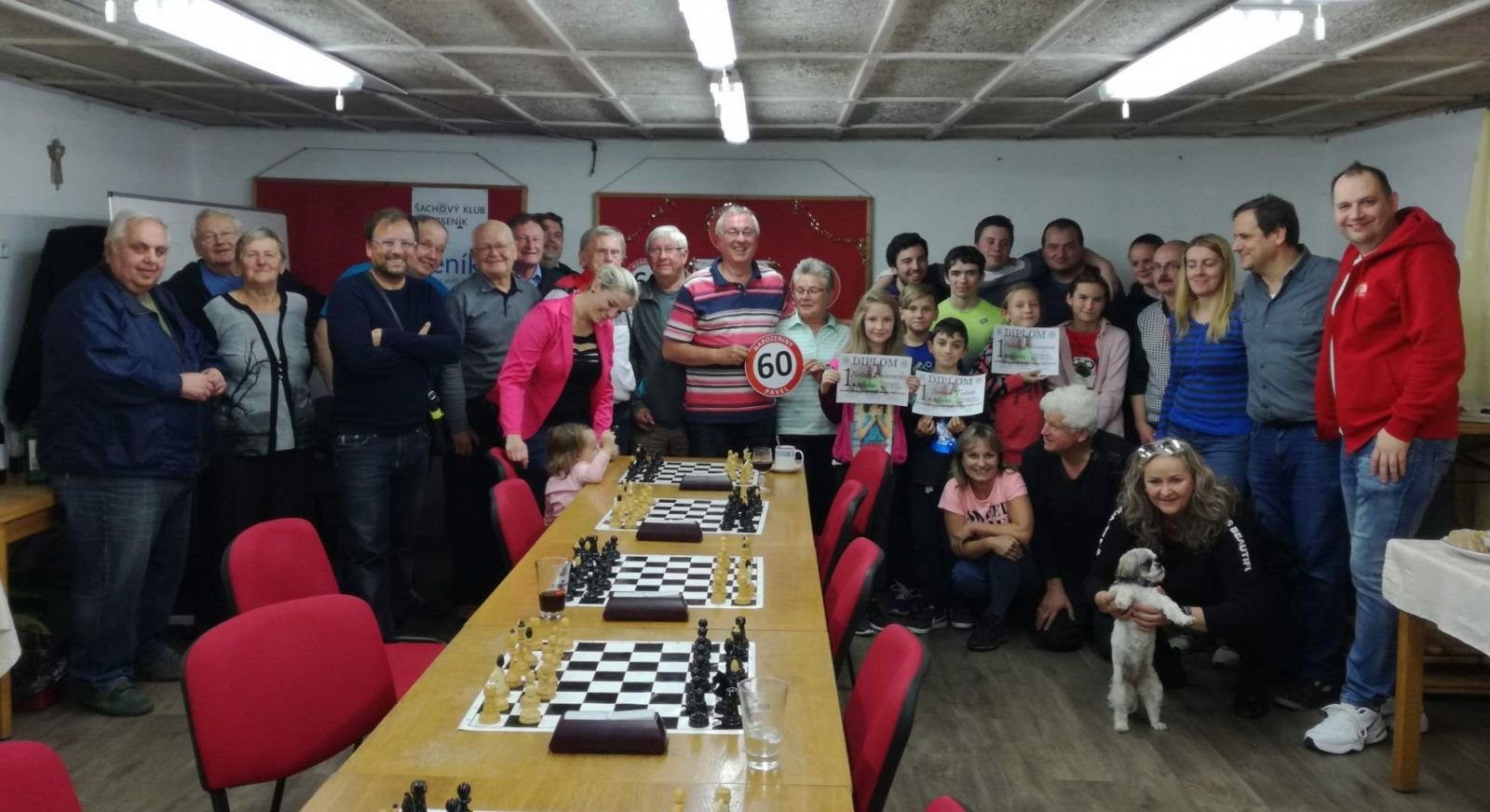 Ve čtvrtek 19.9. jsme s Pavlem Kozákem oslavily jeho 60. narozeninyVe čtvrtek 19.9.2019 členové Šachového klubu Jeseník ve své klubovně společně oslavili 60. narozeniny Pavla Kozáka, výborného kamaráda, šachisty a obětavého funkcionáře. Pavel je součástí našeho klubu už téměř 35 let! Oslavy, kterých se zúčastnilo více jak 30 gratulantů, začaly narozeninovou písní od Svěráka a Uhlíře (video naleznete zde), kterou Pavlovi zapěli všichni zúčastnění. Po gratulacích následoval turnaj v bleskovém šachu. Jubilant odměnil nejlepší dívky, chlapce a ženy. Hlavní turnaj dospělých vyhrál po velkém boji oslavenec Pavel, který včetně narozeninového koeficientu získal 11,25 bodu. Druhé místo obsadil Jarek Dabrowski před Romanem Gawlasem, když oba získali shodně 9,5 bodu (ve vzájemném zápase Jarek Romana porazil). O gratulanty se skvěle starala Pavlova manželka Hanka. Během oslav panovala mezi přítomnými výborná nálada a jelikož jubilant zajistil všem také výborné občerstvení oslavám skutečně nic nechybělo. - fotografie z oslav naleznete zde | |
