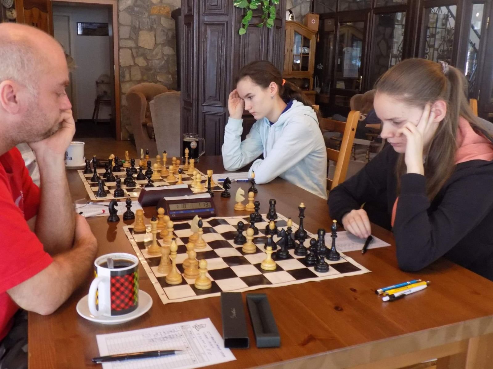 Naše Béčko se v Losinách málem postaralo o překvapení kolaV neděli 9.2.2020 zavítalo naše Béčko do Nových Losin, kde v Penzionu U rybníka sehrálo v rámci 8. kola Oblastního přeboru zápas s družstvem ŠK Velké Losiny B. Hosté byli jasným favoritem. Na všech deskách měli jasnou Elovou převahu. Naše družstvo nastoupilo s pěti nadějnými mládežníky v sestavě (věkový průměr družstva byl 25 let) s předsevzetím uhrát alespoň bod a neodjet s prázdnou. Začátek byl z říše snů, když nejprve na 7. šachovnici porazila Míša Gvizdová (ELO-1150) Ladislava Polácha mladšího (ELO-1571). Tuto partii, ve které Míša nekompromisně potrestala každou soupeřovu chybu si můžete přehrát v odkaze zde. Po-té na 6. šachovnici remizoval Robert Liewehr (ELO-1077) s Milanem Fibichem (ELO-1554). Partie je k přehrání zde. Domácím se podařilo srovnat díky vítězství Anny Malé (ELO-1820) nad Lubomírem Matlochou (ELO-1600) na 4. šachovnici. Další dvě partie skončily remízou, a to na 6. šachovnici mezi Martinem Šmidou (ELO-1545) a Františkem Klézlem (ELO-1665) a na 1. šachovnici mezi Vladimírem Halamou (ELO-1726) a Markem Malým (ELO-2110). Zejména Vláďova remíza proti favorizovanému soupeři byla velmi cenná, když na soupeřův útok odpověděl protiútokem čímž protivníka zaskočil a dovedl tak partii do zdařilé remízy. Partie na 6. šachovnici mezi Jaroslavem Halamou (ELO-1593) a Vojtěchem Mikou (ELO-1723) se poměrně dlouho vyvíjela lépe pro našeho borce. V závěru však Jarda v nadějné pozici přehlídl vidličku a po ztrátě figury partii vzdal. Losinské Béčko se tak poprvé dostalo do vedení 3,5 ku 2,5. Naši hráči se však nezlomili. Martin Valíček (ELO-1482) na 3. šachovnici po fantastickém výkonu porazil losinského předsedu Petra Viktorina (ELO-1772) a opět srovnal. Partie je k přehrání zde. Rozhodnutí tak mělo padnout na 8. šachovnici, kde se v nejdelší partii zápasu utkala Gabriela Morongová (ELO-1205) s Ladislavem Poláchem starším (ELO-1461). Gabča hrála bílými pěkné pro ni typické kombinační šachy a měla během partie i několik šancí na získání rozhodující převahy. Zejména po 23. tahu, kdy tahem Vc1 krásně zaútočila s hrozbou rozbití soupeřovi pěšcové struktury po tahu Vxc6. Soupeř hrál Dd7 a vypadalo to velmi nadějně (viz diagram níže).