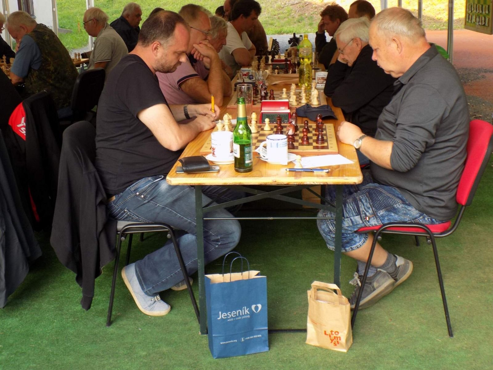 Přátelský zápas s LitomyšlíV sobotu 4.9. odehrálo družstvo našich seniorů doplněno o několik mladších hráčů přátelský zápas se svými vrstevníky z Litomyšle, kteří byly v Jeseníku na výletě. Zápas začal v 17:30 a hrálo se díky pěknému počasí venku pod naším stanem. Po vyrovnaném průběhu nakonec zvítězili hosté z Litomyšle nejtěsnějším rozdílem 4:5 ku 3,5. Po zápase jsme se přesunuly do klubovny kde jsme si ještě v přátelské atmosféře zahráli pár pozápasových partií a u fotek zavzpomínali na společné zážitky z minulosti a na kamarády kteří již nejsou mezi námi.