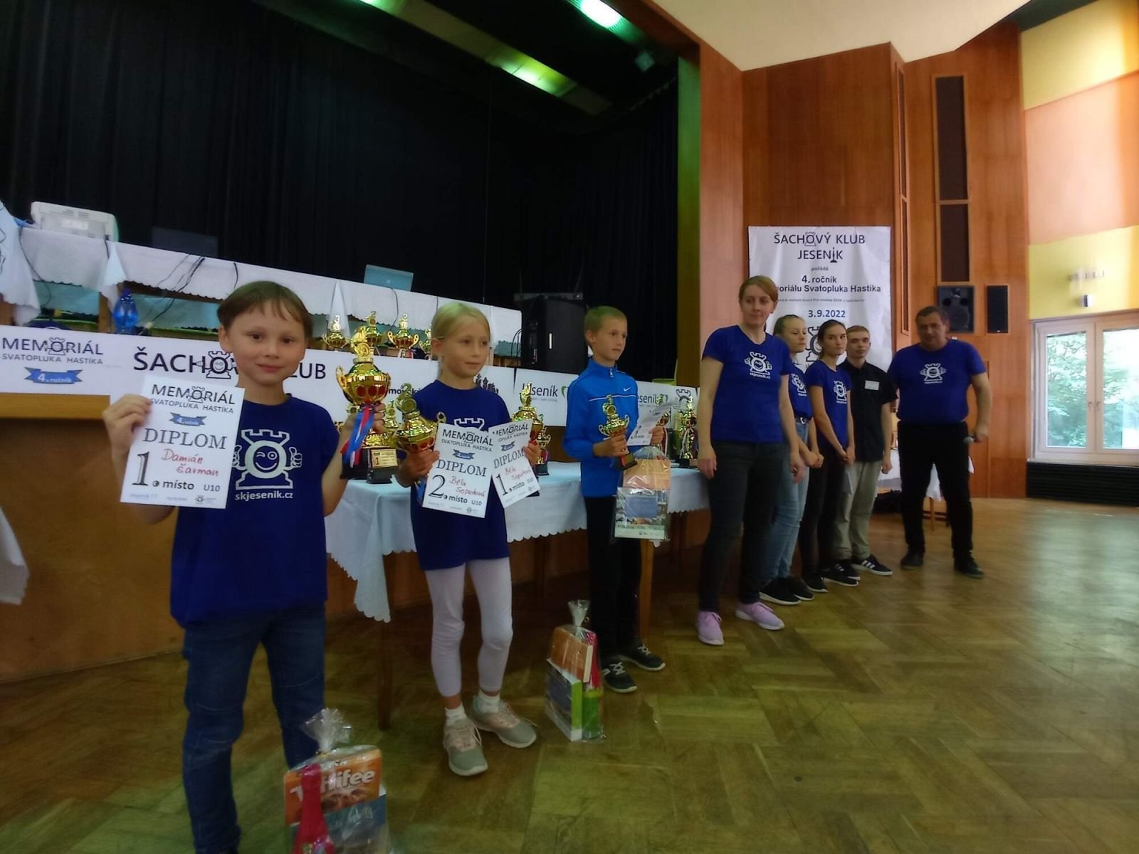 4. ročník Memoriálu Svatopluka Hastíka v režii jesenické šachové mládežeV sobotu 3.9.2022 se ve velkém společenském sále budovy IPOS Městského úřadu v Jeseníku konal 4. ročník Memoriálu Svatopluka Hastíka, který byl zároveň 1. turnajem Grand Prix Olomouckého kraje 2022/2023 v rapid šachu mládeže. Na úvod je potřeba zmínit, že toto šachové klání mělo původně proběhnout až 17.9., ale podle rčení „člověk míní, život mění“ jsme nakonec na poslední chvíli ustoupili paralelně pořádané akci pro jesenické seniory. Bylo nám jasné, že přesun termínu bude mít negativní vliv na celkovou účast a navíc jsme museli vyřešit i náhradu za Radomíra Koláře ml., který měl jako hlavní rozhodčí turnaj původně řídit a v novém termínu měl již jinou dlouhodobě naplánovanou akci. V komplikované situaci jsme si museli poradit, a tak dostala příležitost naše mládež, která se již organizačně podílela jak na turnajích okresní úrovně, tak i na nedávno skončeném JESENÍK OPENU 2022 ve složení Martin Valíček (ročník 2004, hlavní rozhodčí a rozhodčí skupiny OPEN), Gabriela Morongová ml. (2005, rozhodčí skupin A+B a C) a Natálie Morongová (2008, správce online přenosu). Vše zpovzdálí pozoroval a občas s něčím pomohl taká ředitel turnaje Pavel Koriťák. Úkol to byl nelehký, bylo potřeba se turnaje ujmout od začátku do konce zejména při prezenci, jako rozhodčí všech skupin, zajistit online přenos z dvaceti šachovnic, správně spočítat konečné pořadí a na závěr všechny kategorie slavnostně vyhlásit. A jak to všechno dopadlo? Naše mladé trio zvládlo vše bez jediné reklamace či následné opravy včetně již zmiňovaného online přenosu. Devítikolový a u skupiny A dokonce jedenáctikolový turnaj (skupiny A+B a C hráli každý s každým) hraný tempem 12 minut + 3 sekundy za každý tah zvládli odřídit za neuvěřitelných 6 hodin včetně slavnostního vyhlášení! Jsem přesvědčen, že je to sen každého klubového funkcionáře a organizátora šachových turnajů vychovat si takovéto schopné a nadšené nástupce. A jak turnaj, kterého se zúčastnilo celkem 47 šachistů skončil? Nejprve skupiny v rámci Grand Prix mládeže v rapid šachu ŠSOK: Ve sloučené skupině A+B (U10+U12), která měla 11 účastníků a hrálo se systémem každý s každým zvítězil Vojtěch Vaníček (9,5 b.), následován Michaelem Fuentes Lípovým (9,5 b.) a na 3. místě se umístil Damián Šarman (6,5 b.) všichni z domácí ŠK Jeseník. Nejlepší z dívek byla celková čtvrtá Běla Sopuchová (6 b.) rovněž z ŠK Jeseník. V rámci této skupiny byli vyhlášeny tyto kategorie: Ve skupině C (U14), která měla 10 účastníků a hrála se také systémem každý s každým suverénně zvítězil Daniel Ondráček (9 b., ŠK Jeseník) před Lucií Kvapilovou (7 b., SK Prostějov) a Janem Šiskou (7 b., ŠK Olomouc). Mezi děvčaty byla nejlepší Lucie Kvapilová (SK Prostějov), před Helenou Paszkovou a Beátou Burešovou (obě ŠK Jeseník). Nejlepším hráčem kategorie U18, která bylo součástí skupiny OPEN se stal Dan Zrůbek (5,5 b., Agentura 64Grygov) před svým bratrem Adamem Zrůbkem (5,5 b., Agentura 64 Grygov) a Koljou Haidenkem (4,5 b., ŠK Jeseník). Ve skupině OPEN, která se hrála jako mezinárodní turnaj švýcarským systémem na 9 kol se zápisem na rapid FIDE ELO zvítězil Krzysztof Banasik (8 b., TJ Zlaté Hory). Na 2. místě se umístil Patrik Gnida (7 b., Šachy Hošťálková). 3. místo vybojoval Maciej Wrobel (6,5 b., TJ Zlaté Hory). Mezi ženami byla nejlepší Veronika Ondráčková (ŠK Jeseník), nejlepším seniorem nad 65 let Miroslav Čecháček (ŠK Jeseník) a skokanem turnaje Dan Zrůbek (Agentura 64 Grygov). Díky skvělé atmosféře, kterou vytvořili všichni účastnící turnaje, výborní rozhodčí Martin Valíček a Gabriela Morongová ml., správce online přenosu Natálie Morongová a ochotná a usměvavá obsluha v bufetu Gabriela Morongová st. a Edita Koritáková st. proběhl turnaj bezproblémově a v naprosté pohodě. Poděkování patří všem členům Šachového klubu Jeseník, kteří s přípravou a organizací turnaje obětavě pomáhali, speciálně pak Martinu Šarmanovi za přípravu výborného hovězího guláše a za finanční podporu Městu Jeseník a Šachovému svazu Olomouckého kraje. - konečné pořadí turnaje: skupina A+B skupina C skupina OPEN - fotografie z turnaje naleznete zde - video z turnaje od Edity Koriťákové ml. naleznete zde --- online přenos --- Všechny vysílané partie stáhnout v PGN níže v sekci "Ke stažení".