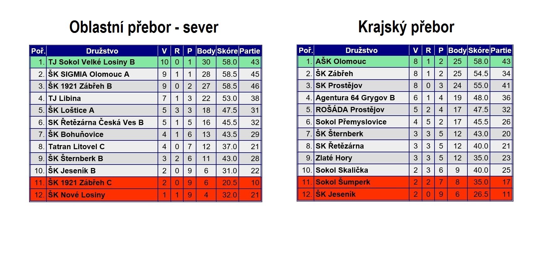Posledním 11.kolem byl zakončen oblastní a krajský přebor družstev v šachu2. a 9.4. byly 11.kolem završeny boje v oblastním a krajském přeboru družstev v šachu. V oblastním přeboru skončilo naše B družstvo na 10. místě se ziskem šesti bodů a v krajském přeboru naše A družstvo na posledním 12. místě rovněž se ziskem šesti bodů. Všem našim šachistům kteří zasáhli do bojů jak v oblastním tak i v krajském přeboru patří poděkování za vzornou reprezentaci našeho klubu. - podrobné výsledky všech kol s konečnou tabulkou oblastního přeboru naleznete v odkaze: link - podrobné výsledky všech kol s konečnou tabulkou krajského přeboru naleznete v odkaze: link | |