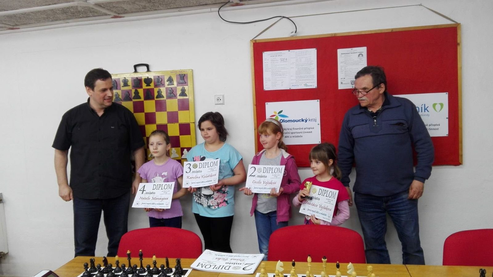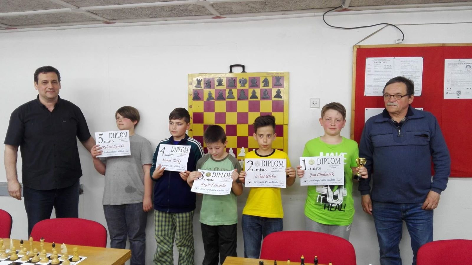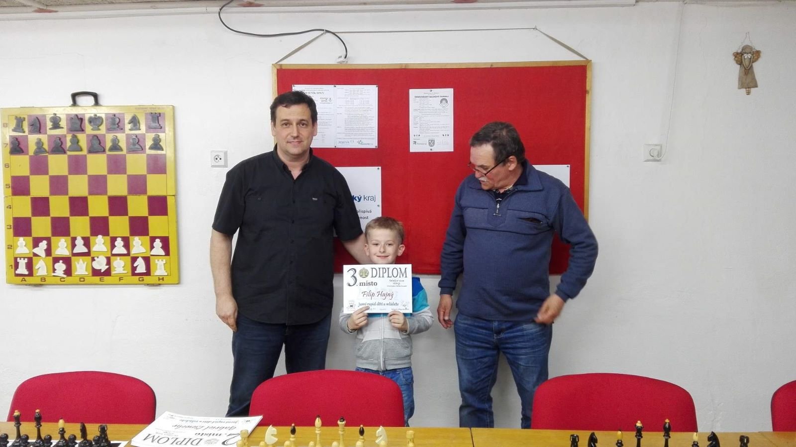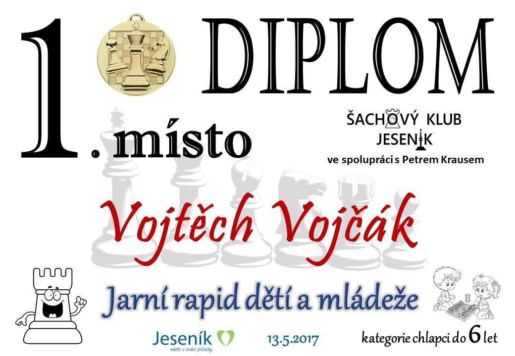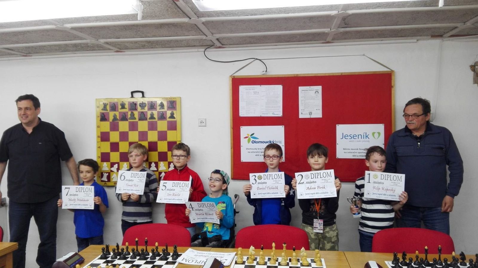Jarní rapid dětí a mládeže v Jeseníku již zná své vítězeV sobotu 13.5.2017 byl v klubovně Šachového klubu Jeseník odehrán Jarní rapid dětí a mládeže. Turnaj zorganizoval ŠK Jeseník ve spolupráci s Petrem Krausem, který věnoval vítězům krásné poháry. Petr se nakonec ze zdravotních důvodů nemohl turnaje zúčastnit přesto mu patří velký dík za jeho obětavost a nezjištnost bez které by turnaj nemohl proběhnout. Jarní rapid se hrál tempem 2 x 15 minut na 7 kol a zúčastnilo se ho celkem 27 dětí z ŠK Jeseník, SK Řetězárny Česká Ves, TJ Zlaté Hory, TJ Sport Mikulovice, ŠK 1921 Zábřeh a ŠK Mohelnice. Turnaj se hrál ve třech skupinách. V první skupině proti sobě nastoupilo 8 statečných dívek. Ve druhé skupině bylo 11 chlapců do 10 let a ve třetí skupině 8 chlapců do 14 let. Podle získaných bodů ve skupinách byly poté vyhlášeny kategorie dívky do 9, 12 a 14 let a chlapci do 6, 8, 12 a 14 let. V kategorii dívek do 9 let zvítězila sedmiletá Stázinka Vojčáková z TJ Zlaté Hory se 4 body. Na 2. místě se umístila její sestra Cecilka Vojčáková (3 body), na 3. místě Kája Kolaříková (3 body) a na 4. místě Natálka Morongová (1 bod) obě z TJ Sport Mikulovice. V kategorii dívek do 12 let zvítězila Gabča Morongová (4 body) z TJ Sport Mikulovice, před Diankou Tichou (2 body) z ŠK Jeseník. V kategorii dívek do 14 let se umístila na 1. místě Míša Gvizdová (7 bodů) před Dominikou Tschulikovou (5 bodů) obě z ŠK Jeseník. V kategorii chlapců do 6 let obsadil 1. místo teprve pětiletý Votěch Vojčák z TJ Zlaté Hory, který v soubojích i z více jak o pěl let staršími šachisty získal úctyhodných 1,5 bodu. V kategorii chlapců do 8 let zvítězil Filip Langr (5 bodů) z ŠK Mohelnice. Na 2. místě se umístil Gabriel Liewehr (3 body) a na 3. místě Filip Hajný (2,5 bodu) oba z ŠK Jeseník. Kategorie do 10. let byla nejpočetnější. Mezi sedmi šachisty v této věkové kategorii byl nejlepší Filip Kopecký (7 bodů) z ŠK 1921 Zabřeh. Na 2. místě se umístil Adam Pírek (5 bodů) z SK Řetězárny Česká Ves, na 3. místě Daniel Tschulik (4,5 bodu) z ŠK Jeseník, na 4. místě Martin Klimeš (4 body) z ŠK 1921 Zábřeh, na 5. místě Jan Besler (4 body) z SK Řetězárny Česká Ves, na 6. místě Tomáš Krč (3,5 bodu) z TJ Zlaté Hory a na 7. místě Matěj Neubauer (2 body) z ŠK Jeseník. V kategorii do 12 let se umístil na 1. místě Jan Cimburek (7 bodů) z SK Řetězárny Česká Ves, na 2. místě Lukáš Blaha (5,5 bodu) z ŠK 1921 Zábřeh, na 3. místě Kryštof Liewehr (3 body) z ŠK Jeseník, na 4. místě Martin Horký (2,5 bodu) z ŠK Jeseník a na 5. místě Robert Liewehr (2,5 bodu) z ŠK Jeseník. V kategorii do 14 let zvítězil Marek Blaha (5,5 bodu), před Martinem Valíčkem (3 body) z SK Řetězárny Česká Ves a Karlem Dočkalem (1 bod) z TJ Sport Mikulovice. Na závěr byla vyhlášena cena fair play, kterou komise rozhodčích ve složení Pavel Koriťák ml, Eduard Till, Lubomír Matlocha st. a Miloš Hudský udělila Martinu Klimešovi z ŠK 1921 Zábřeh za houževnatost, příkladné chování, čistou a poctivou hru a dodržování zásad fair play. - fotografie z turnaje naleznete níže nebo v odkaze: link | |