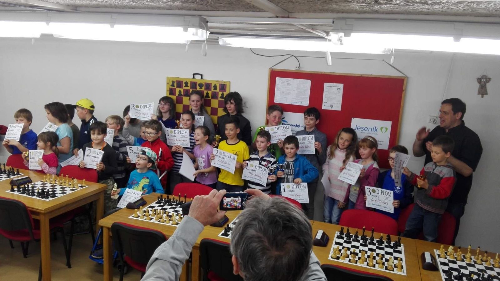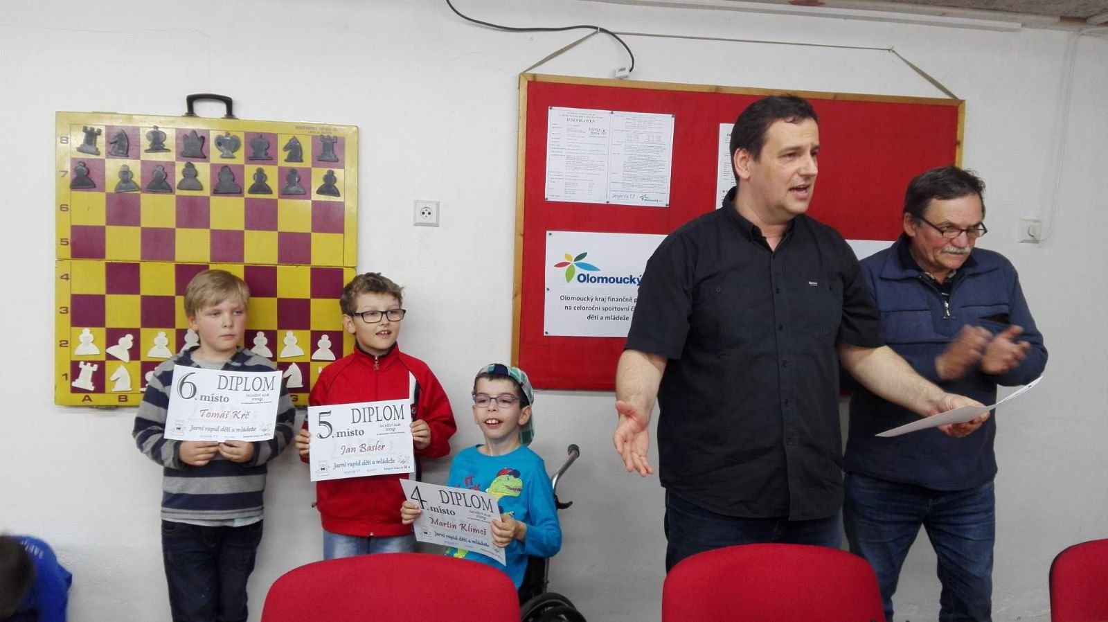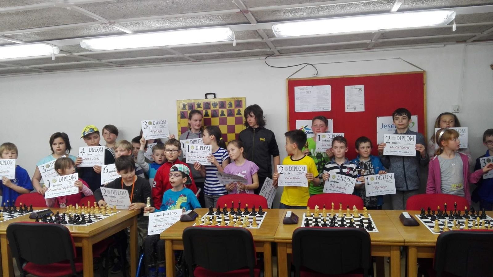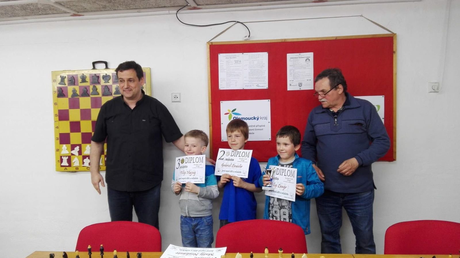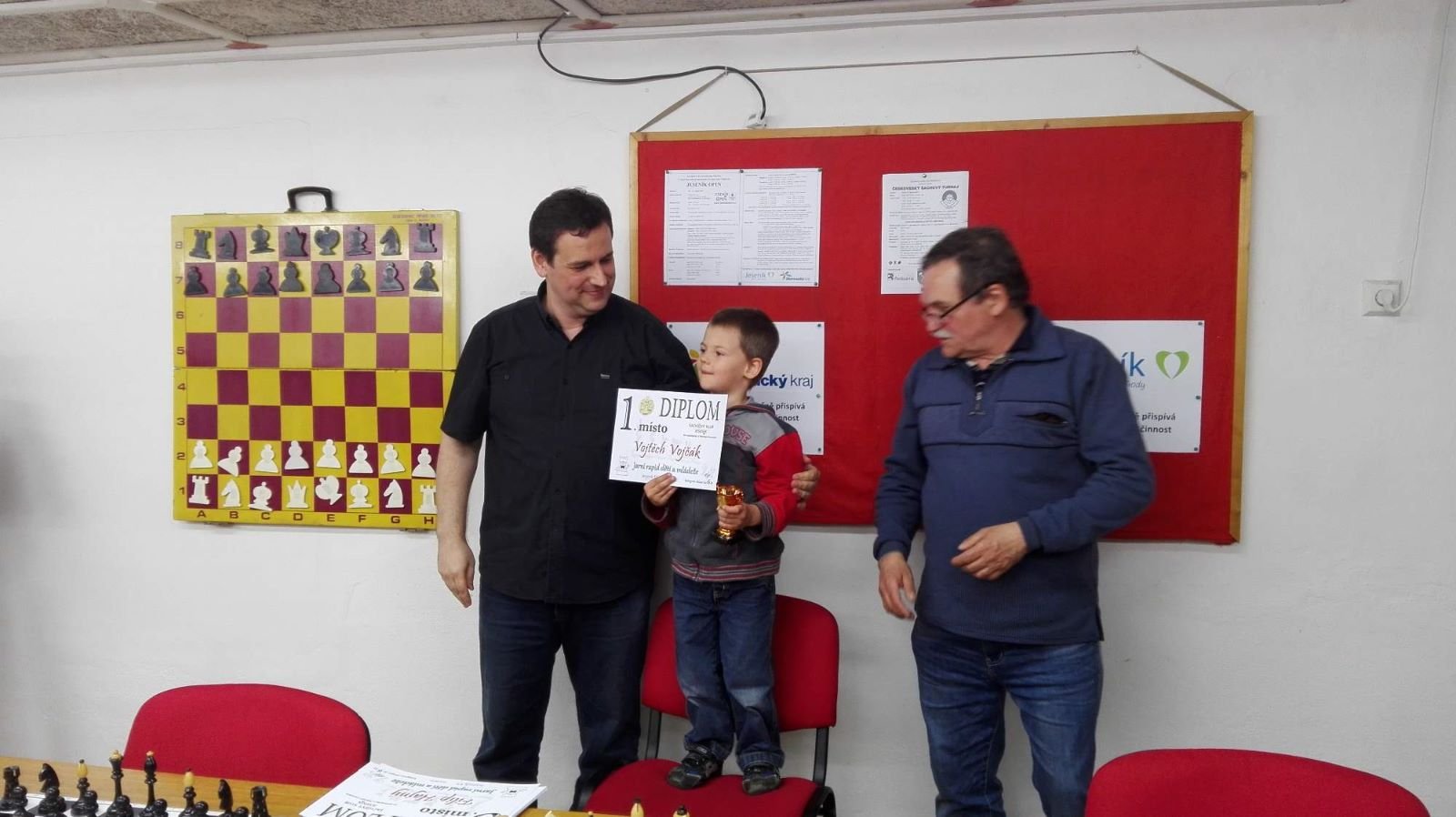 Jarní rapid dětí a mládeže v Jeseníku již zná své vítězeV sobotu 13.5.2017 byl v klubovně Šachového klubu Jeseník odehrán Jarní rapid dětí a mládeže. Turnaj zorganizoval ŠK Jeseník ve spolupráci s Petrem Krausem, který věnoval vítězům krásné poháry. Petr se nakonec ze zdravotních důvodů nemohl turnaje zúčastnit přesto mu patří velký dík za jeho obětavost a nezjištnost bez které by turnaj nemohl proběhnout. Jarní rapid se hrál tempem 2 x 15 minut na 7 kol a zúčastnilo se ho celkem 27 dětí z ŠK Jeseník, SK Řetězárny Česká Ves, TJ Zlaté Hory, TJ Sport Mikulovice, ŠK 1921 Zábřeh a ŠK Mohelnice. Turnaj se hrál ve třech skupinách. V první skupině proti sobě nastoupilo 8 statečných dívek. Ve druhé skupině bylo 11 chlapců do 10 let a ve třetí skupině 8 chlapců do 14 let. Podle získaných bodů ve skupinách byly poté vyhlášeny kategorie dívky do 9, 12 a 14 let a chlapci do 6, 8, 12 a 14 let. V kategorii dívek do 9 let zvítězila sedmiletá Stázinka Vojčáková z TJ Zlaté Hory se 4 body. Na 2. místě se umístila její sestra Cecilka Vojčáková (3 body), na 3. místě Kája Kolaříková (3 body) a na 4. místě Natálka Morongová (1 bod) obě z TJ Sport Mikulovice. V kategorii dívek do 12 let zvítězila Gabča Morongová (4 body) z TJ Sport Mikulovice, před Diankou Tichou (2 body) z ŠK Jeseník. V kategorii dívek do 14 let se umístila na 1. místě Míša Gvizdová (7 bodů) před Dominikou Tschulikovou (5 bodů) obě z ŠK Jeseník. V kategorii chlapců do 6 let obsadil 1. místo teprve pětiletý Votěch Vojčák z TJ Zlaté Hory, který v soubojích i z více jak o pěl let staršími šachisty získal úctyhodných 1,5 bodu. V kategorii chlapců do 8 let zvítězil Filip Langr (5 bodů) z ŠK Mohelnice. Na 2. místě se umístil Gabriel Liewehr (3 body) a na 3. místě Filip Hajný (2,5 bodu) oba z ŠK Jeseník. Kategorie do 10. let byla nejpočetnější. Mezi sedmi šachisty v této věkové kategorii byl nejlepší Filip Kopecký (7 bodů) z ŠK 1921 Zabřeh. Na 2. místě se umístil Adam Pírek (5 bodů) z SK Řetězárny Česká Ves, na 3. místě Daniel Tschulik (4,5 bodu) z ŠK Jeseník, na 4. místě Martin Klimeš (4 body) z ŠK 1921 Zábřeh, na 5. místě Jan Besler (4 body) z SK Řetězárny Česká Ves, na 6. místě Tomáš Krč (3,5 bodu) z TJ Zlaté Hory a na 7. místě Matěj Neubauer (2 body) z ŠK Jeseník. V kategorii do 12 let se umístil na 1. místě Jan Cimburek (7 bodů) z SK Řetězárny Česká Ves, na 2. místě Lukáš Blaha (5,5 bodu) z ŠK 1921 Zábřeh, na 3. místě Kryštof Liewehr (3 body) z ŠK Jeseník, na 4. místě Martin Horký (2,5 bodu) z ŠK Jeseník a na 5. místě Robert Liewehr (2,5 bodu) z ŠK Jeseník. V kategorii do 14 let zvítězil Marek Blaha (5,5 bodu), před Martinem Valíčkem (3 body) z SK Řetězárny Česká Ves a Karlem Dočkalem (1 bod) z TJ Sport Mikulovice. Na závěr byla vyhlášena cena fair play, kterou komise rozhodčích ve složení Pavel Koriťák ml, Eduard Till, Lubomír Matlocha st. a Miloš Hudský udělila Martinu Klimešovi z ŠK 1921 Zábřeh za houževnatost, příkladné chování, čistou a poctivou hru a dodržování zásad fair play. - fotografie z turnaje naleznete níže nebo v odkaze: link | |