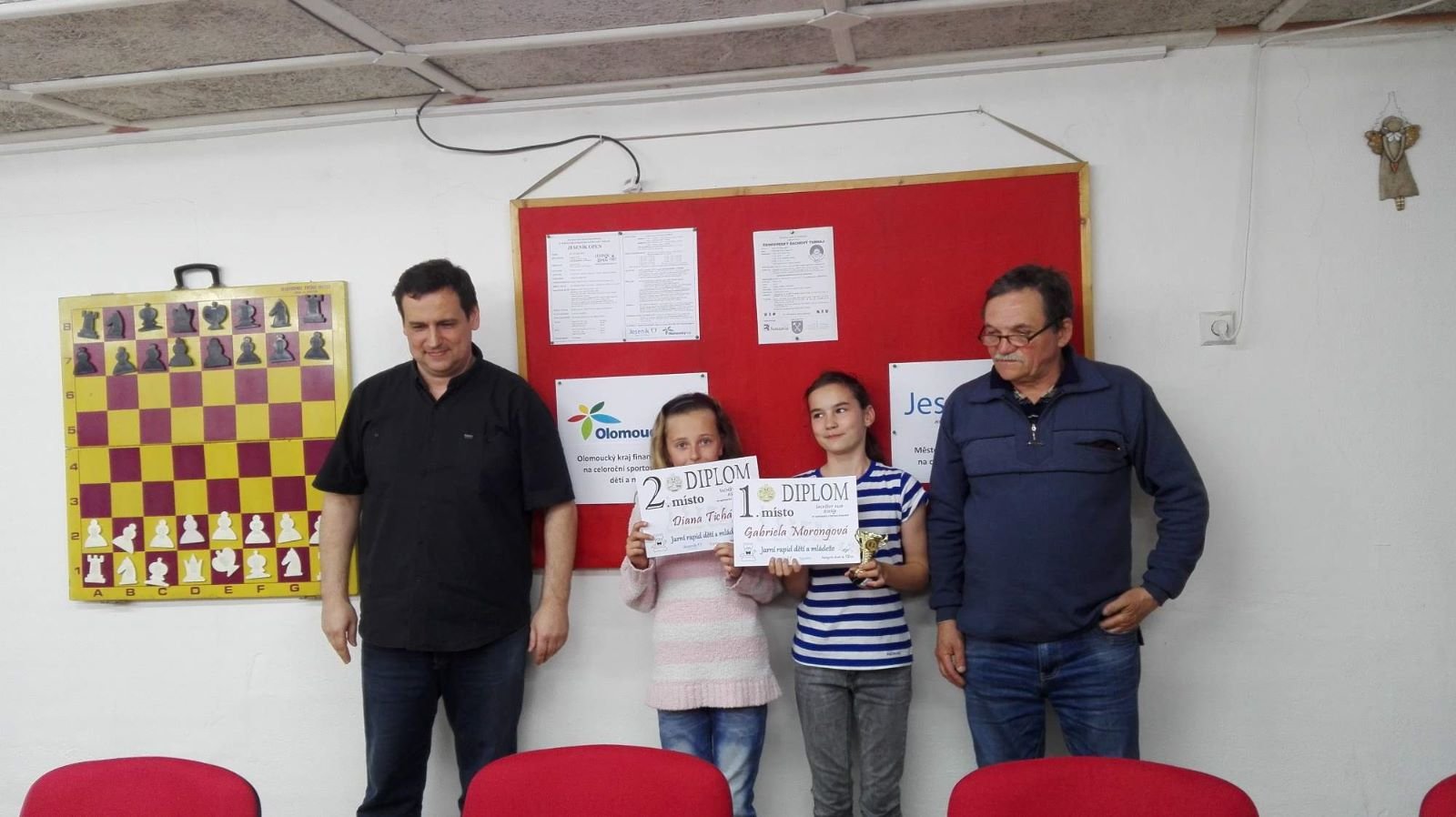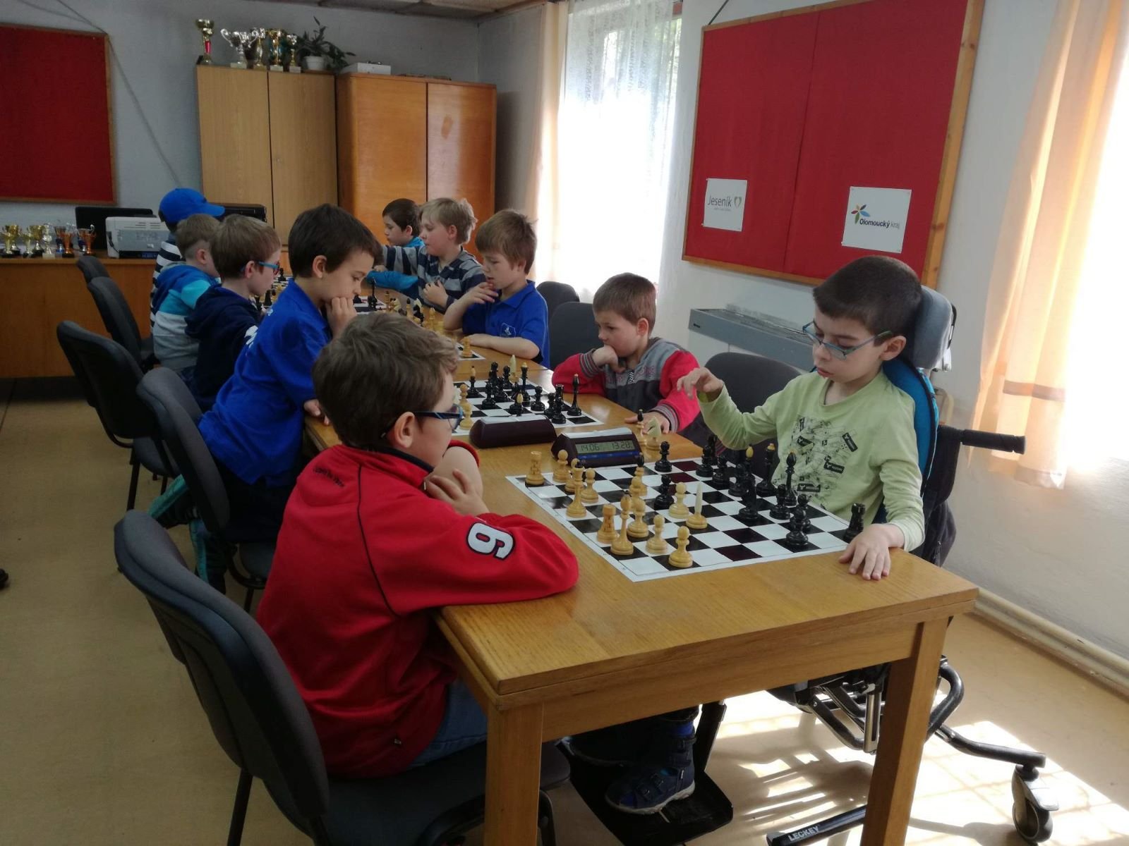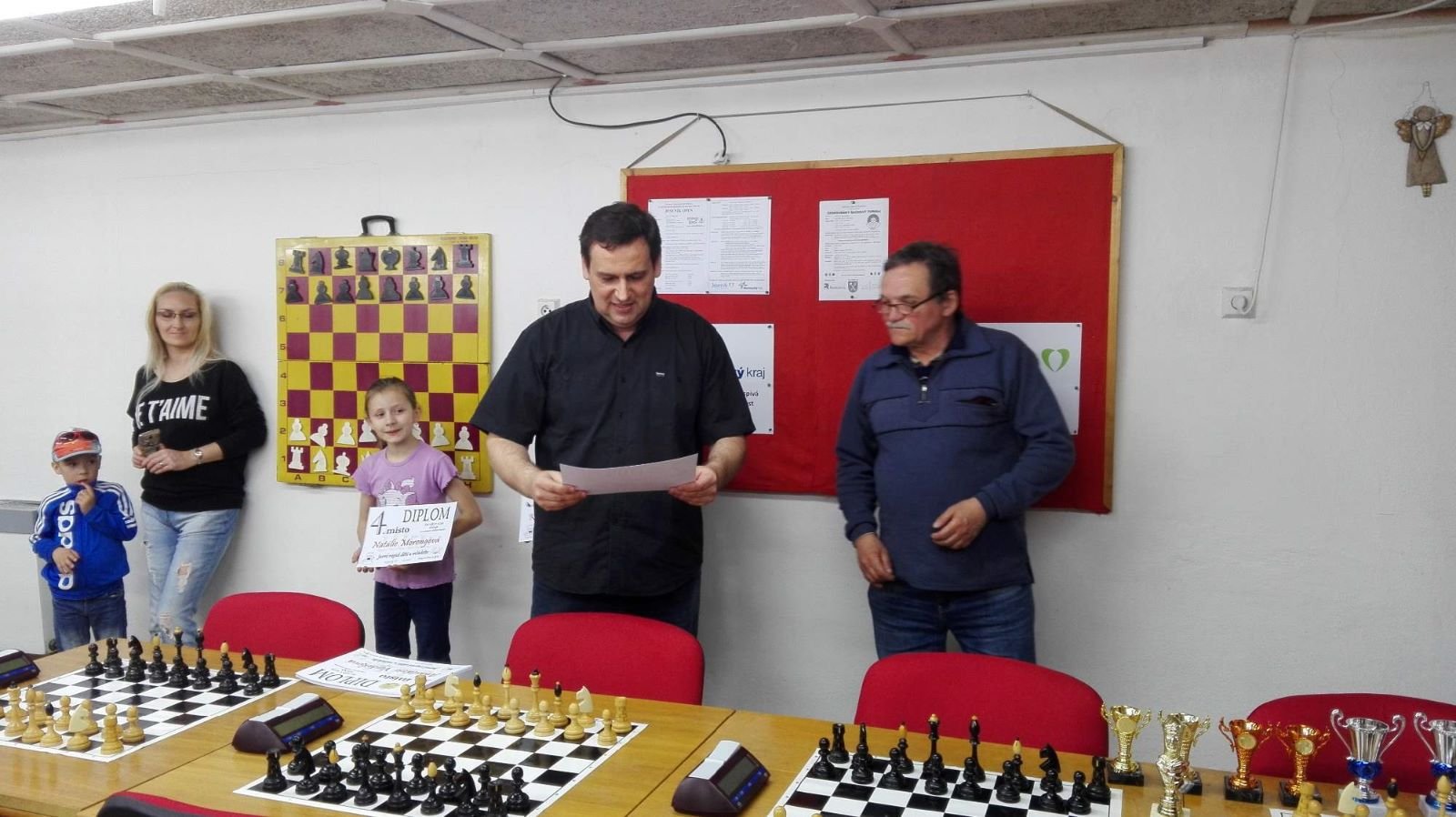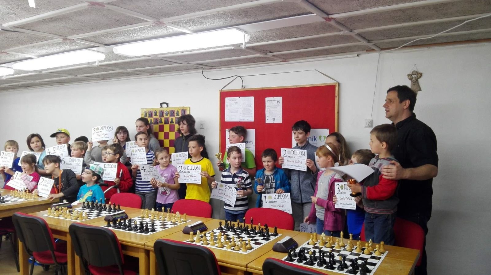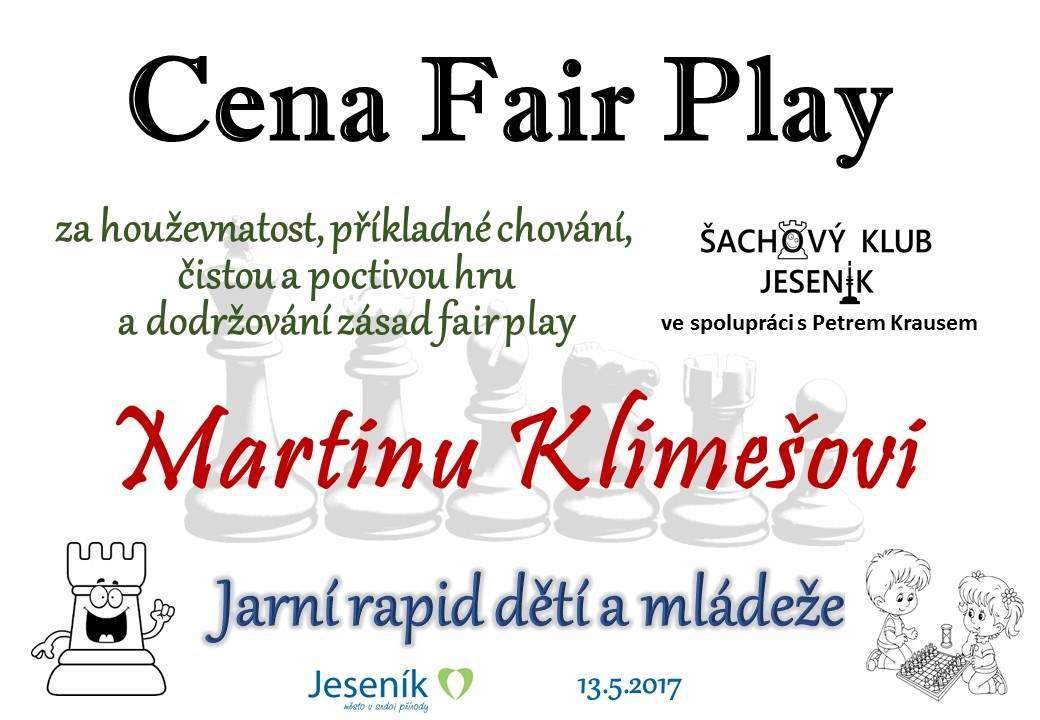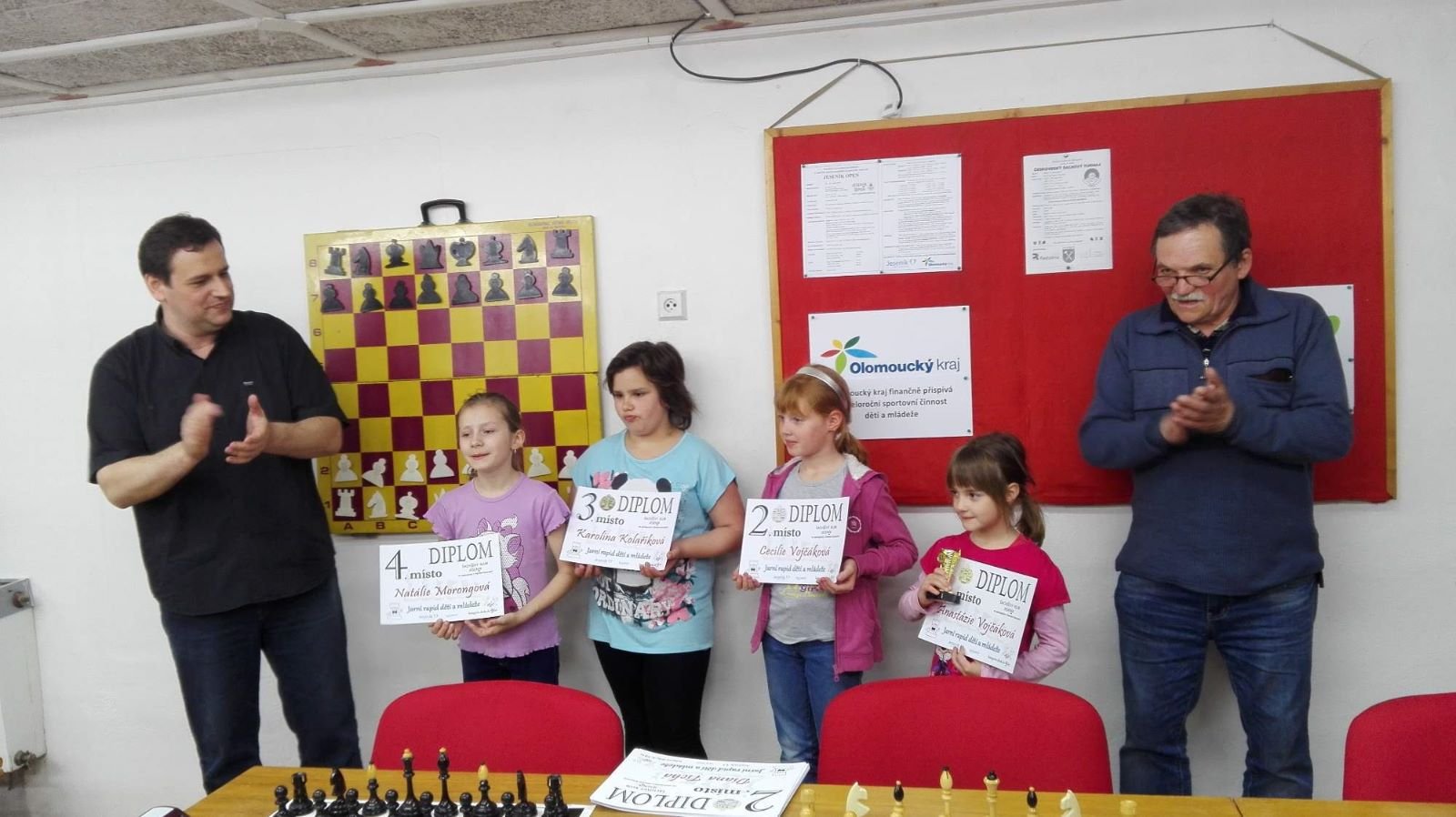 Jarní rapid dětí a mládeže v Jeseníku již zná své vítězeV sobotu 13.5.2017 byl v klubovně Šachového klubu Jeseník odehrán Jarní rapid dětí a mládeže. Turnaj zorganizoval ŠK Jeseník ve spolupráci s Petrem Krausem, který věnoval vítězům krásné poháry. Petr se nakonec ze zdravotních důvodů nemohl turnaje zúčastnit přesto mu patří velký dík za jeho obětavost a nezjištnost bez které by turnaj nemohl proběhnout. Jarní rapid se hrál tempem 2 x 15 minut na 7 kol a zúčastnilo se ho celkem 27 dětí z ŠK Jeseník, SK Řetězárny Česká Ves, TJ Zlaté Hory, TJ Sport Mikulovice, ŠK 1921 Zábřeh a ŠK Mohelnice. Turnaj se hrál ve třech skupinách. V první skupině proti sobě nastoupilo 8 statečných dívek. Ve druhé skupině bylo 11 chlapců do 10 let a ve třetí skupině 8 chlapců do 14 let. Podle získaných bodů ve skupinách byly poté vyhlášeny kategorie dívky do 9, 12 a 14 let a chlapci do 6, 8, 12 a 14 let. V kategorii dívek do 9 let zvítězila sedmiletá Stázinka Vojčáková z TJ Zlaté Hory se 4 body. Na 2. místě se umístila její sestra Cecilka Vojčáková (3 body), na 3. místě Kája Kolaříková (3 body) a na 4. místě Natálka Morongová (1 bod) obě z TJ Sport Mikulovice. V kategorii dívek do 12 let zvítězila Gabča Morongová (4 body) z TJ Sport Mikulovice, před Diankou Tichou (2 body) z ŠK Jeseník. V kategorii dívek do 14 let se umístila na 1. místě Míša Gvizdová (7 bodů) před Dominikou Tschulikovou (5 bodů) obě z ŠK Jeseník. V kategorii chlapců do 6 let obsadil 1. místo teprve pětiletý Votěch Vojčák z TJ Zlaté Hory, který v soubojích i z více jak o pěl let staršími šachisty získal úctyhodných 1,5 bodu. V kategorii chlapců do 8 let zvítězil Filip Langr (5 bodů) z ŠK Mohelnice. Na 2. místě se umístil Gabriel Liewehr (3 body) a na 3. místě Filip Hajný (2,5 bodu) oba z ŠK Jeseník. Kategorie do 10. let byla nejpočetnější. Mezi sedmi šachisty v této věkové kategorii byl nejlepší Filip Kopecký (7 bodů) z ŠK 1921 Zabřeh. Na 2. místě se umístil Adam Pírek (5 bodů) z SK Řetězárny Česká Ves, na 3. místě Daniel Tschulik (4,5 bodu) z ŠK Jeseník, na 4. místě Martin Klimeš (4 body) z ŠK 1921 Zábřeh, na 5. místě Jan Besler (4 body) z SK Řetězárny Česká Ves, na 6. místě Tomáš Krč (3,5 bodu) z TJ Zlaté Hory a na 7. místě Matěj Neubauer (2 body) z ŠK Jeseník. V kategorii do 12 let se umístil na 1. místě Jan Cimburek (7 bodů) z SK Řetězárny Česká Ves, na 2. místě Lukáš Blaha (5,5 bodu) z ŠK 1921 Zábřeh, na 3. místě Kryštof Liewehr (3 body) z ŠK Jeseník, na 4. místě Martin Horký (2,5 bodu) z ŠK Jeseník a na 5. místě Robert Liewehr (2,5 bodu) z ŠK Jeseník. V kategorii do 14 let zvítězil Marek Blaha (5,5 bodu), před Martinem Valíčkem (3 body) z SK Řetězárny Česká Ves a Karlem Dočkalem (1 bod) z TJ Sport Mikulovice. Na závěr byla vyhlášena cena fair play, kterou komise rozhodčích ve složení Pavel Koriťák ml, Eduard Till, Lubomír Matlocha st. a Miloš Hudský udělila Martinu Klimešovi z ŠK 1921 Zábřeh za houževnatost, příkladné chování, čistou a poctivou hru a dodržování zásad fair play. - fotografie z turnaje naleznete níže nebo v odkaze: link | |