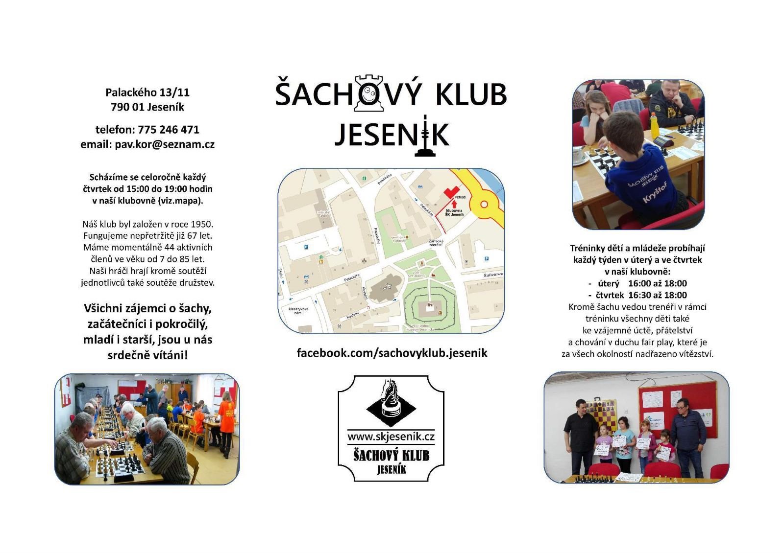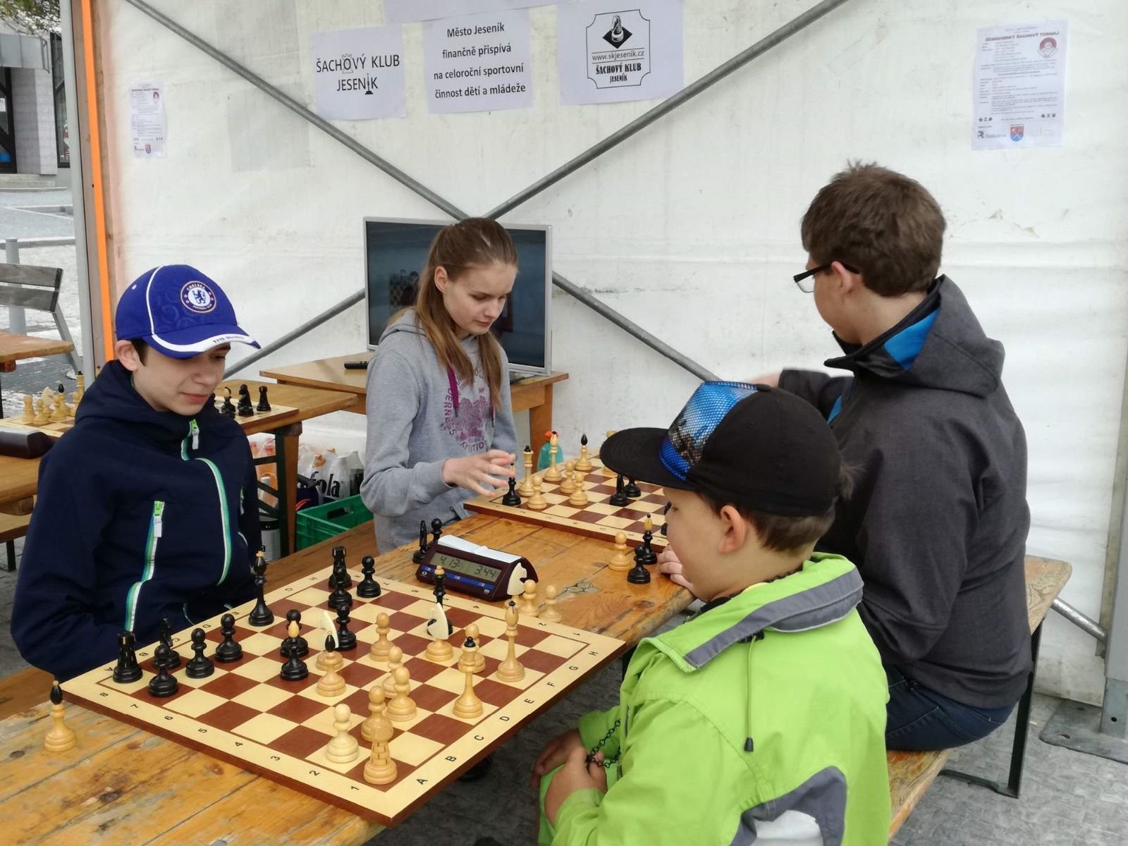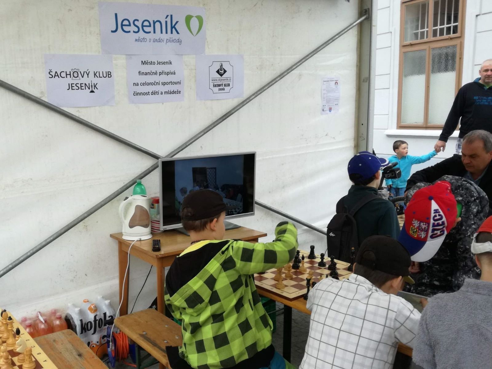 Šachový klub Jeseník na Sousedských slavnostech v JeseníkuV sobotu 20.5. se Šachový klub Jeseník poprvé aktivně zúčastnil Sousedských slavností na Masarykově náměstí v Jeseníku. Naši členové a členové šachové oddílu z SK Řetězárny Česká Ves především z řad dětí mládeže sehráli řadu šachových partií s návštěvníky těchto slavností všech věkových kategorií a rádi začátečníkům vysvětlily i základy šachu. Děkujeme pořádajícímu spolku SUDETIKUS a její předsedkyní Martině Seidlerové, že jsme mohly šachy i náš klub na této krásné akci prezentovat. fotografie z akce naleznete níže nebo v odkaze: link | |
