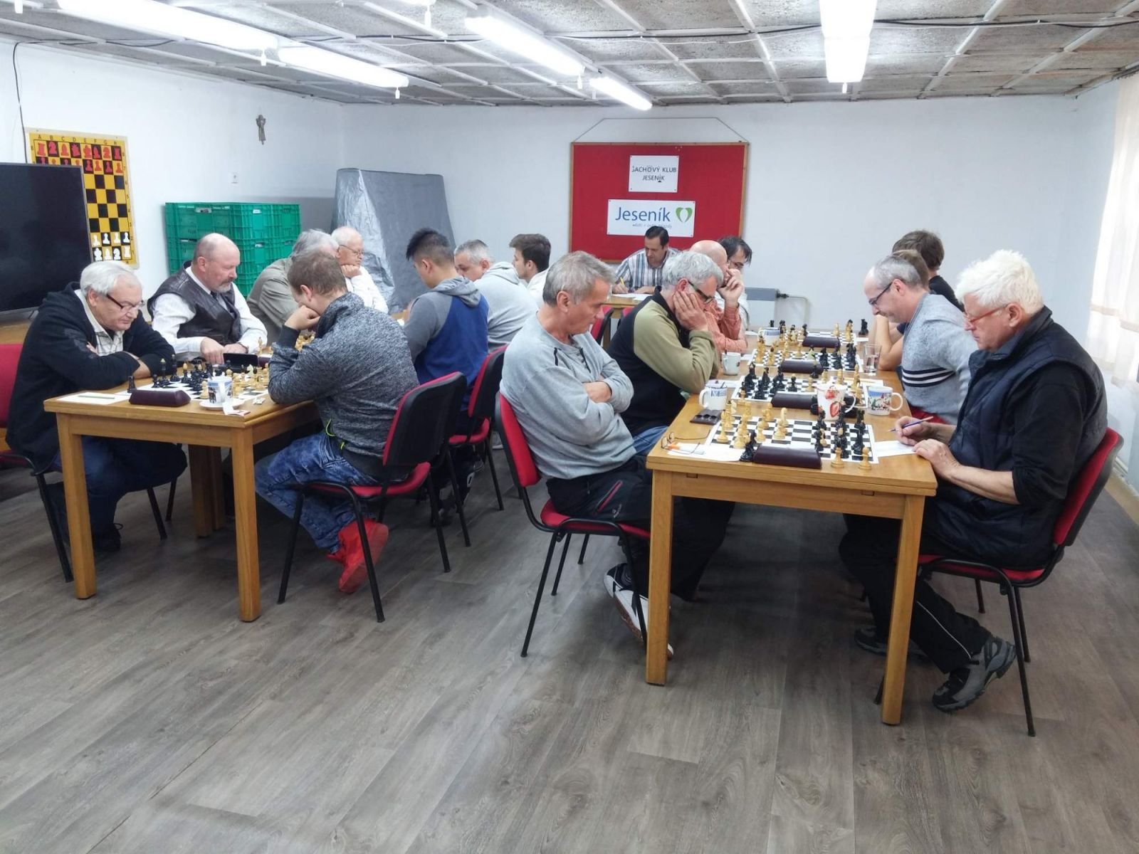 Naše Béčko začalo oblast vítězstvím nad Novými LosinamiV neděli 14.10.2018 bylo v klubovně ŠK Jeseník odehráno 1. kolo oblastního přeboru družstev, ve kterém naše Béčko přivítalo ŠK Nové Losiny. Domácí byli papírovým favoritem a utkání začali vítězstvím Pavla Koriťáka nad Markem Fibichem na 8. šachovnici. Po-té uhrál remízu na 5. šachovnici Milan Šmoldas s Radkem Fibichem. Na 2,5 ku 0,5 zvýšil vedení jesenického Béčka Bogdan Kolodziej, který porazil na 3. šachovnici Miroslava Fabiana. Hostům se podařilo snížit na 2,5:1,5 díky vítězství Jiřího Horáka nad Martinem Šmidou na 1. šachovnici. Kapitán domácích Bedřich Táborský však vzápětí porazil na 4. šachovnici Ladislava Polácha a zvýšil na 3,5 ku 1,5. Po-té se v zabetonované pozici domluvili na remíze Jiří Málek s Le Viet Cuongem na 7. šachovnici. Na zbylých šachovnicích 2 a 6 tak bojovali hosté z Nových Losin alespoň o celkovou remízu. Na 6. šachovnici však domácí Lubomír Matlocha postupně získal jak materiálovou, tak poziční výhodu, kterou stále vylepšoval, než hostujícímu Danielu Podhornému nezbylo než partii vzdát a bylo rozhodnuto. Po-té se na 2. šachovnici domluvili na remíze Vladimír Halama s Vojtěchem Mikem a uzavřeli tak účet zápasu na konečných 5,5 ku 2,5 pro ŠK Jeseník B. - všechny výsledky 1. kola naleznete zde nebo zde - průběžnou tabulku po 1. kole naleznete zde nebo zde - fotografie ze zápasu naleznete zde | |